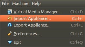 Next, run VirtualBox, and select 'Import Appliance' from its file menu: